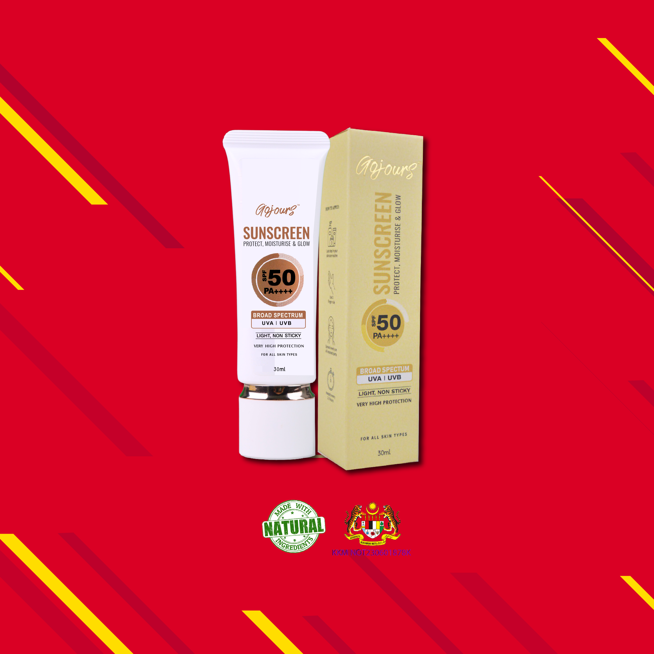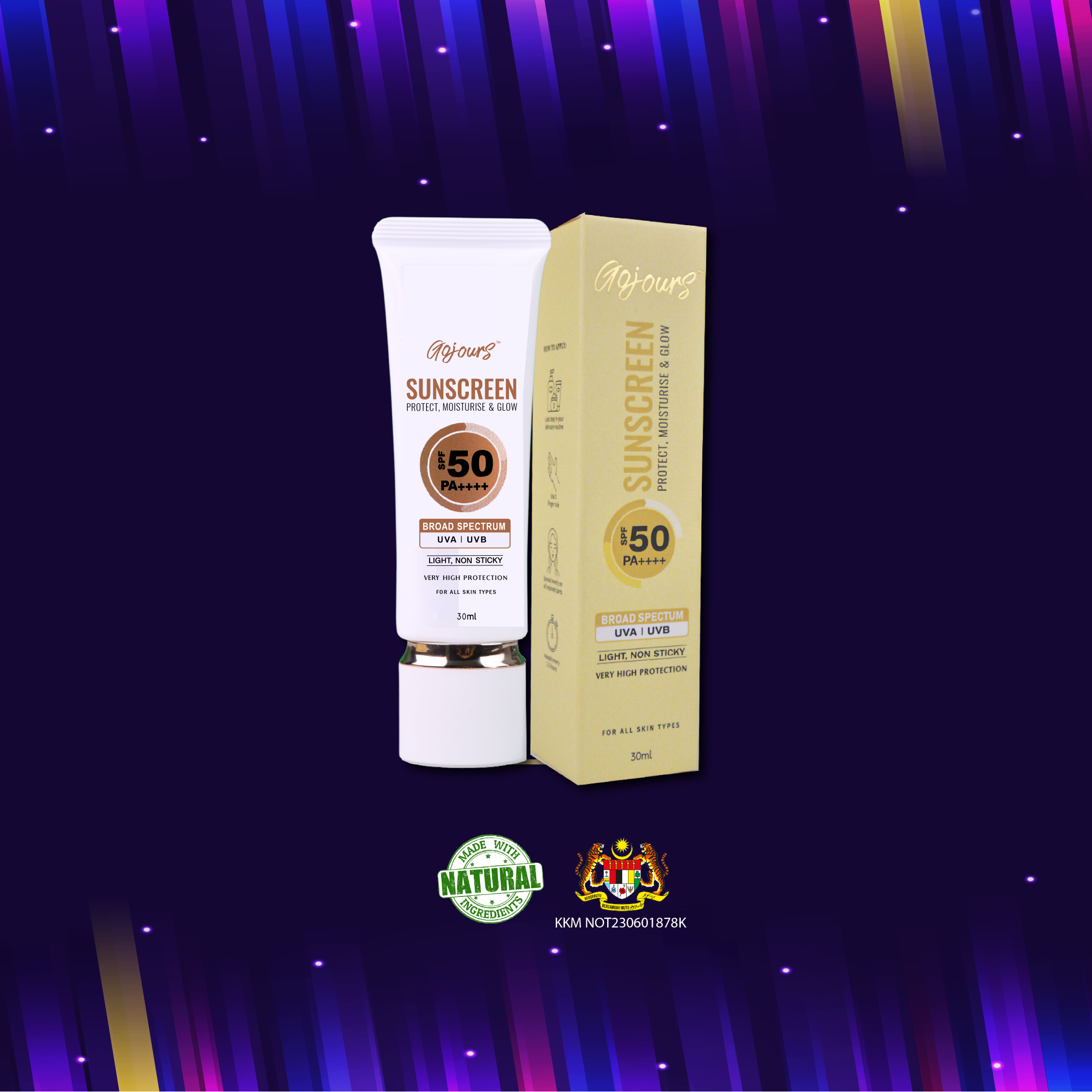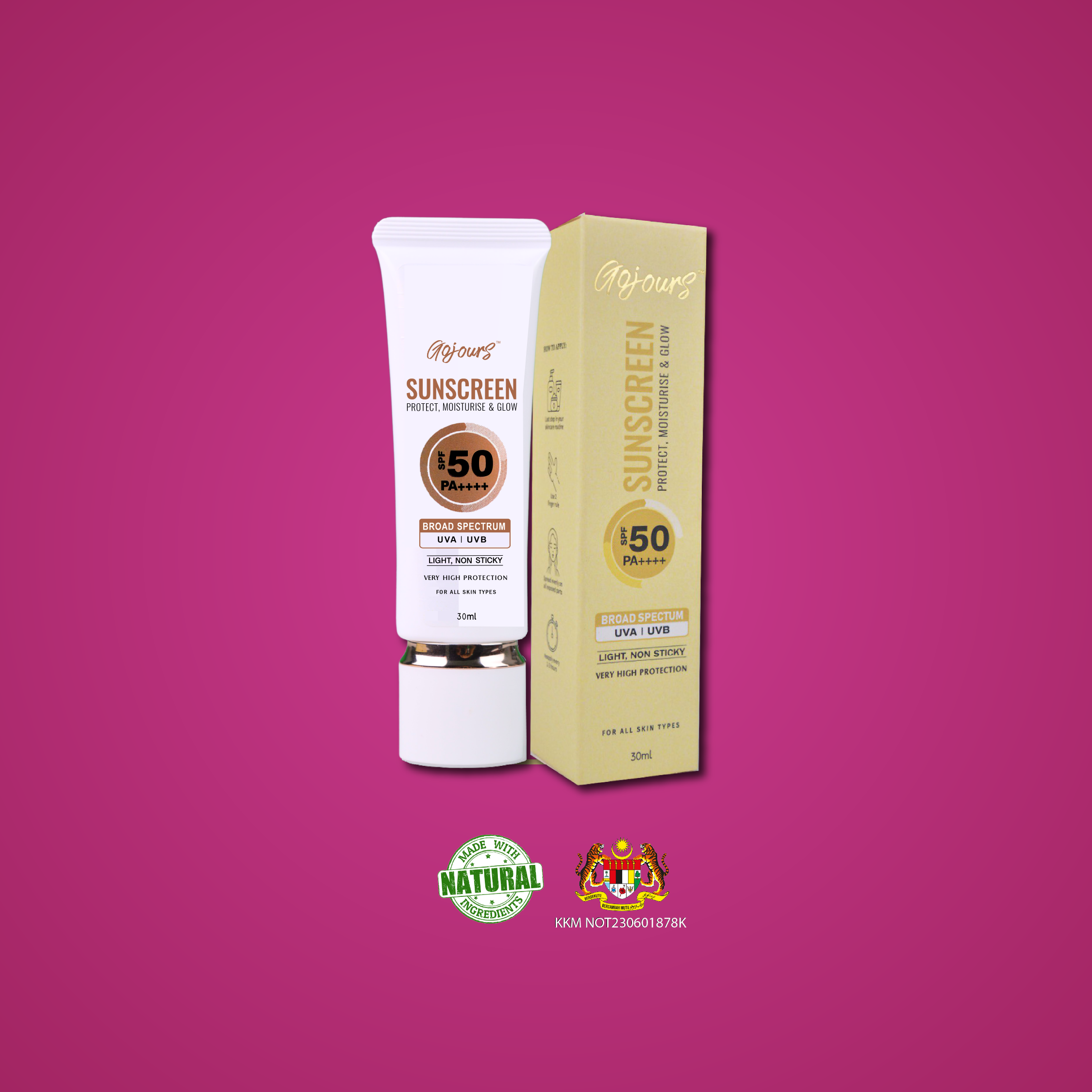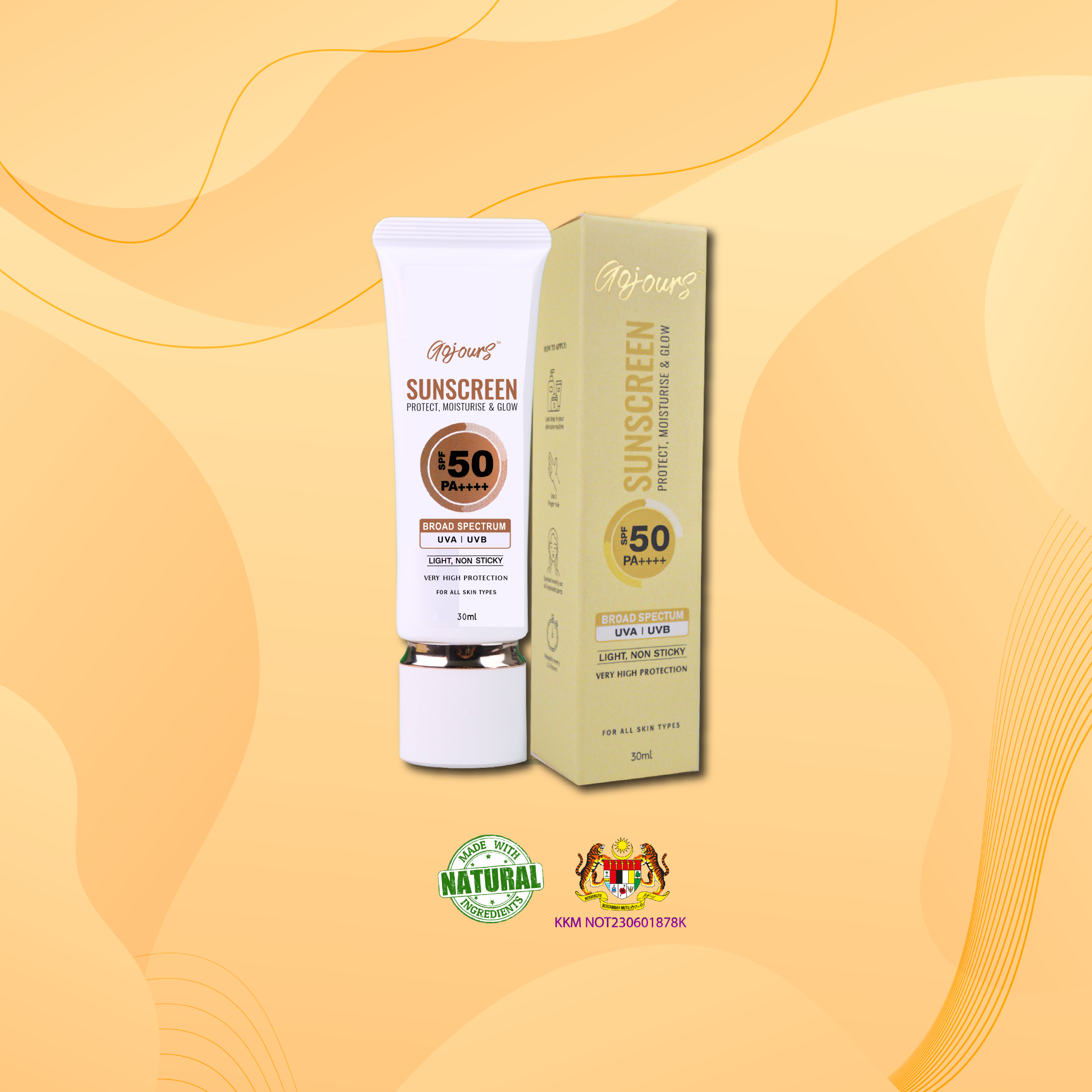 Gojours Sunscreen is a lightweight, non-sticky hybrid sunscreen that provides broad spectrum protection from UVA, UVB and blue light. It is also enriched with Niacinamide, Quinoa Seed Extract, Centella Asiatica Extract and Pisum Sativum (Pea) Extract to protect, moisturise and glow the skin. Gojours Sunscreen gives a subtle smooth finish which makes it ideal as a makeup base. It comes with high SPF 50 PA ++++ which will guard your skin against the damaging UV rays of the sun. Recommended for all skin types.
